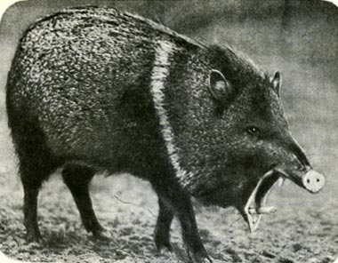 Ошейниковый пекари. В Мексике и Южной Америке обитает еще белогубый пекари. Пекари похожи на свиней и близки им по крови, но отличаются, например, тем, что верхние клыки растут у них не вверх, а вниз.