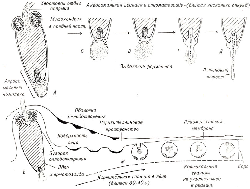 В сперматозоидах некоторых животных при сближении с яйцеклеткой наблюдается акросомалъная реакция. Микронити некоторых акросом неизвестным пока образом быстро реорганизуются и образуют акросомную нить, прокалывающую яйцеклетку. В сперматозоидах других видов животных образуются ферменты, которые способствуют проникновению сперматозоида через студенистую оболочку и другие покрывающие яйцеклетку слои.