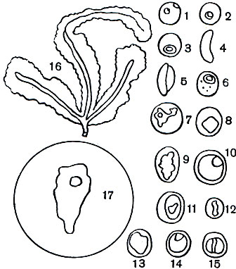 Таблица 4. Разные стадии жизненного цикла возбудителей человеческой малярии в эритроцитах крови человека (1-15) и в слюнных железах комара-переносчика Anopheles (16, 17) с препаратов, окрашенных по Гимза-Романовскому: 1-5 - возбудитель тропической малярии Plasmodium falciparum: 1-начало роста шизонта в эритроците, в одном эритроците два мелких 'кольца', в каждом из них по одному окрашенному в красный цвет ядру; 2, 3-более крупные 'кольца', одно (2) с двумя, другое (3) с одним ядром; 4-бобовидная макрогамета; 5-микрогаметоцит; 6-11 - возбудитель трехдневной малярии P. Vivax; 6-молодой шизонт в начале роста в форме кольца; 7-более крупный одноядерный шизонт амебоидной формы; 8-растущий шизонт с четырьмя ядрами; 9-выросший шизонт, распадающийся на одноядерные мерозоиты; 10-макрогамета; 11-микрогаметоцит; 12 -15 - возбудитель четырехдневной малярии P. malariae: 12-растущий шизонт в форме пояска; 13-выросший шизонт, распадающийся на одноядерные мерозоиты; 14-макрогамета; 15-микрогаметоцит; 16- продольный разрез через слюнную железу комара Anopheles maculipennis; в клетках железы, обладающих крупными ядрами, расположены многочисленные веретеновндные спорозоиты, часть их вышла в проток железы. 17-мазок слюнной железы комара Anopheles superpictus, зараженного малярийным плазмодием; в центре крупная клетка железы с ядром, вокруг нее многочисленные веретеновндные одноядерные спорозоиты