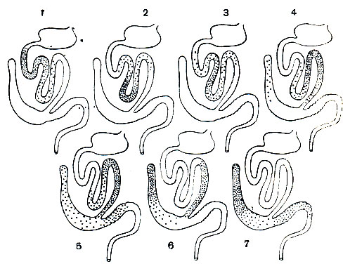 Рис. 74. Локализация разных видов кокцидий рода Eimeria в кишечнике кролика: 1 - Eimeria media; 2 - Е. irresidua; 3 - Е. реrforans; 4 - Е. magna; 5 - Е. intestinalis; 6 - Е. coecicola; 7 - Е. piriformis