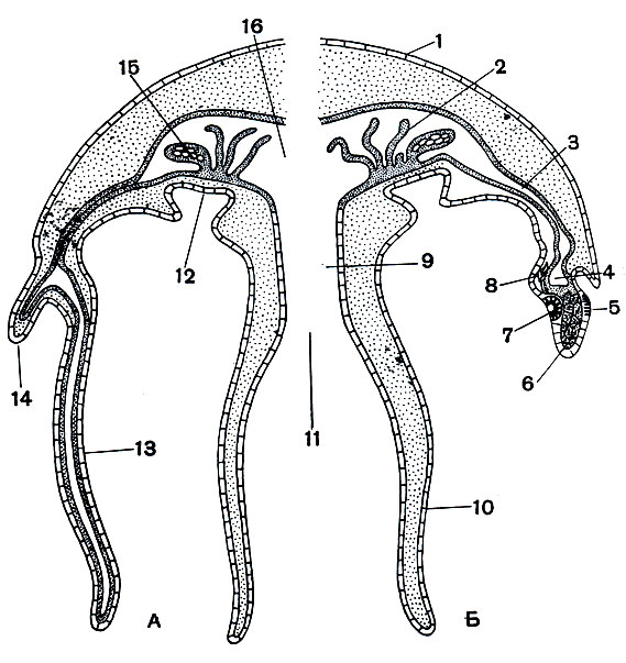 Сцифоидные (Scyphozoa). Полипы, относящиеся к этому классу, очень мелкие, всего несколько миллиметров высотой. Как правило, они не образуют колоний и в большинстве случаев лишены скелетной, оболочки. Тело сцифоидного полипа (он также называется сцифистомой) подразделяется на чашечку и ножку. В верхней части тела, по краю чашечки, сцифистома снабжена венчиком щупалец, между которыми на ротовом конце помещается четырехугольное ротовое отверстие. Гастральная полость сцифистомы разделена четырьмя неполными внутренними перегородками (септы, тениоли) на центральную часть и 4 периферические камеры. В верхней части тениоли несут по небольшому отверстию, через которое соседние камеры сообщаются между собой. Внутрь каждой тениоли со стороны ротового конуса вдается коническая полость - воронка. Со дна воронки вниз тянется заштрихована, энтодерма отмечена частым пунктиром, мезоглея - редким пунктиром.