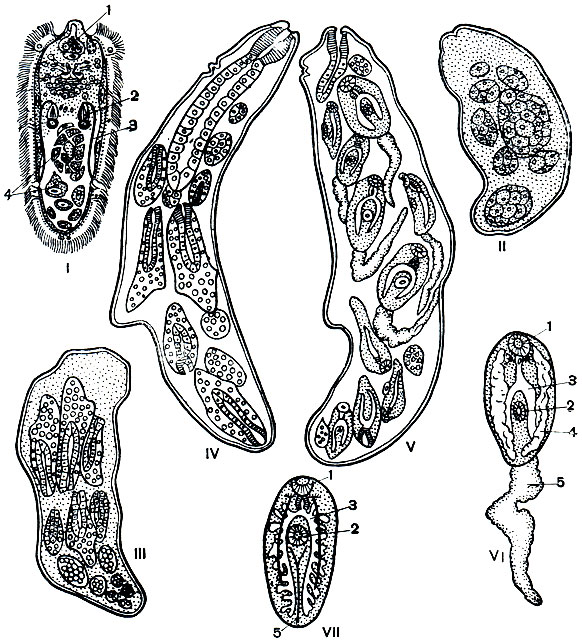 Рис. 202. Стадии развития фасциолы печеночной. I - мирацидий: 1 - кишечник; 2 - протонефридий; 3 - выводной канал протонефридия; 4 - зародышевые клетки; II - III - спороцисты, в которых развиваются редии; IV - редия, в которой повторно развиваются редии; V - редия, в которой развиваются церкарии; VI - церкарии: 1 - передняя, или ротовая, присоска; 2 - брюшная присоска; 3 - кишечник; 4 - железы; 5 - хвост; VII - адолескарий: 1, 2, 3 - см. VI; 5 - выделительная система