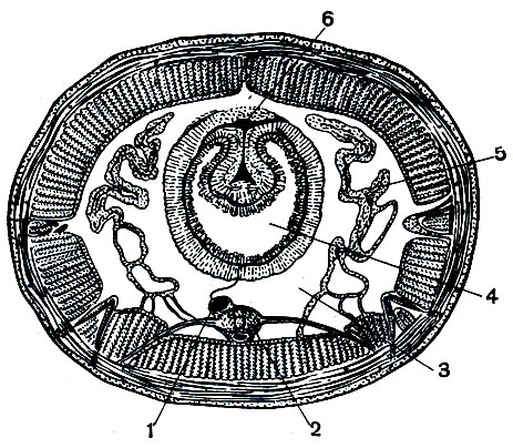 Стенка тела олигохет состоит из пяти основных слоев: тонкой неклеточной кутикулы, выделяемой кожей, кожного эпителия, состоящего из одного слоя клеток, двух слоев - мускулатуры наружного кольцевого и внутреннего продольного и, наконец, внутреннего слоя целомического эпителия, ограничивающего вторичную полость тела, или целом, в которой располагаются внутренние органы. Эта полость, заполненная более или менее прозрачной жидкостью, содержащей взвешенные в ней клетки, не тянется непрерывно вдоль всего тела, а разделена тонкими мускульными перегородками - диссепиментами - на отдельные отсеки, соответствующие наружной сегментации. Таким образом, в каждом сегменте находится свой обособленный участок полости тела, а в нем - пара своих выделительных органов - нефридиев, один справа, другой слева (рис. 273). Имеется замкнутая кровеносная система: продольные сосуды идут вдоль всего тела, связывающие их кольцевые сосуды имеются в каждом сегменте. Пищеварительный канал проходит вдоль всего тела от ротового отверстия до анального; обычно он подразделяется на отделы: ротовая полость, глотка, пищевод, иногда зоб, один или несколько желудков, средняя кишка (самая длинная часть), задняя кишка (рис. 274).