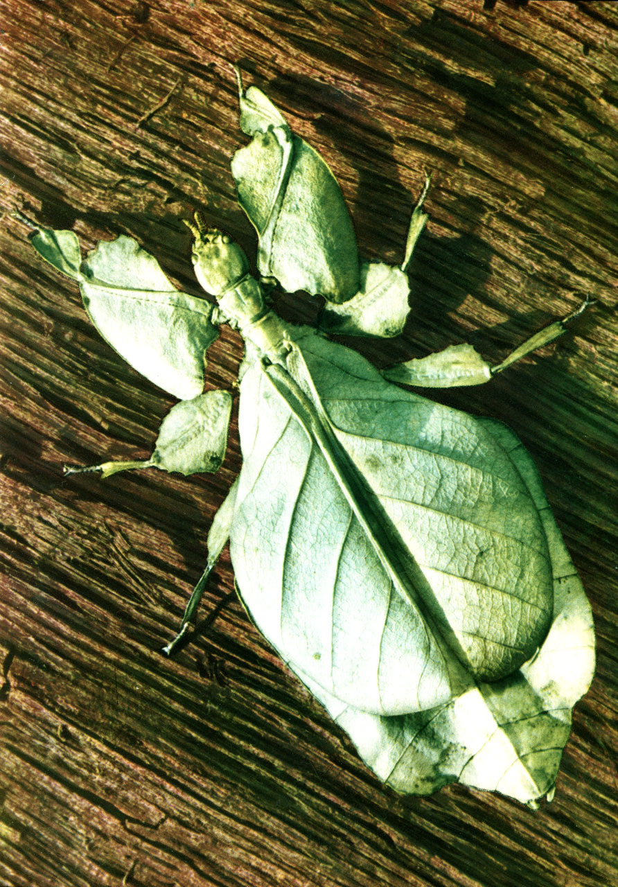Справа - индийский палочник (Carausius morosus) похожий на сухую веточку. Рядом с ним его яйца в 10-кратном увеличении. Внизу - самка цейлонской листовидки (Phyllium crucifolium). Форма, окраска и колебательные движения делают этих насекомых похожими на зеленый лист растения. Оба этих вида мы относим к привиденьевым (Phasmida). Привиденьевые - отряд, включающий около 2,5 тысяч видов травоядных насекомых, преимущественно тропических. По своему внешнему виду они идеально приспособлены к окружающей среде, поэтому их очень трудно заметить в природе. Сверх того, они еще отличаются очень малой подвижностью и способны целые часы проводить неподвижно. При необходимости почему-либо изменить место они перемещаются с такой медлительностью, что движения их почти неуловимы (снимки даны в незначительном увеличении).