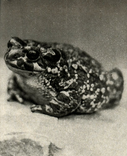 Серая, или обыкновенная, жаба (Bufo bufo) широко распространена в Европе, Северной и Центральной Азии и в Северо-Западной Африке. Живет она в лесах, садах и на полях. В дневные часы прячется в грудах камней, в сырых подвалах. Ночью выходит на охоту, подстерегая членистоногих, улиток, червей, а иногда и мелких позвоночных. На снимке изображена самка европейского подвида в натуральную величину; средиземноморский подвид отличается еще большими размерами.