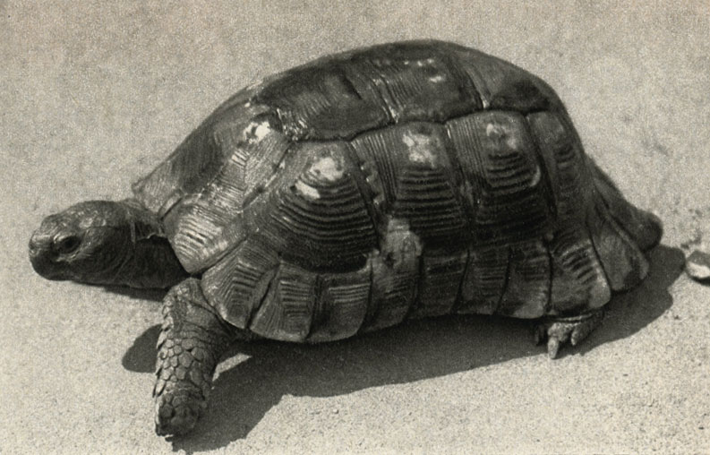 Некоторые черепахи могут похвалиться особенно богато украшенным панцырем, как например мадагаскарская лучистая черепаха (Testudo radiata). Она кормится главным образом побегами и сочными плодами растений. В засушливые периоды эти черепахи укрываются в вырытых в земле ямах или под камнями. Их сильно выпуклый черный панцырь украшен ярко-желтыми лучами. Это великолепное животное в преклонном возрасте также достигает значительных размеров, однако это случается очень редко, так как лучистую черепаху в массе отлавливают из-за ее вкусного мяса. При поимке сухопутные черепахи, как правило, не обороняются. Они только втягивают под панцырь голову, подгибают ноги и безропотно отдаются своей судьбе (1/4 натуральной величины).