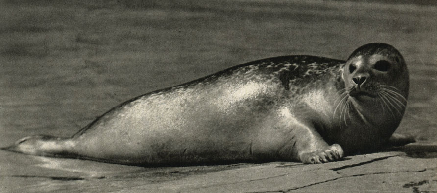 Внизу - обыкновенный тюлень (Phoca vitulina), на Дальнем Востоке называется ларга. Его длина 1,5-2 м, вес около 1 ц. Окраска желтовато-серая с темными пятнами. Живет в Северной Атлантике от Гренландии до Португалии, у северных берегов Азии и в Тихом океане у берегов Северной Америки до Мексики на юге. Кормится рыбой, моллюсками и ракообразными.