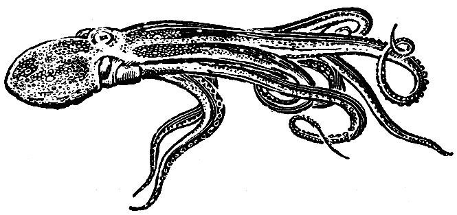 Осьминог может и плавать при помощи особого органа - воронки. Туловище осьминога окутано кожной складкой - мантией. Под мантией находится мантийная полость. Вблизи головы из этой полости торчит наружу конусовидная трубка - воронка, направленная вперед, к голове. Набрав через особую щель в мантийную полость воду, осьминог сразу выбрасывает ее через воронку. Получается резкий толчок - "отдача", и осьминог быстро передвигается и в воде.