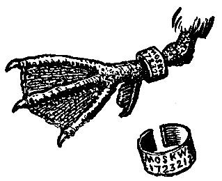 Узнают, где рязанские, а где камчатские птицы зимуют, какими путями-дорогами они летят, при помощи маленьких алюминиевых колечек. Птенцу или взрослой птице на ногу надевают колечко. На нем несколько букв, цифр и номер. Под этим номером в книге записей указано: где, кем и когда окольцована эта птица. А буквы - условное обозначение адреса научного учреждения (Бюро кольцевания). Поймают или убьют окольцованную птицу, колечко перешлют в Бюро кольцевания, а там по записям узнают, где оно было надето. Каждый год кольцуют сотни тысяч птиц, но лишь немногие тысячи колечек возвращаются в Бюро.