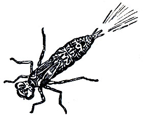 Дотроньтесь прутиком до спокойно лежащей на дне личинки. Тронули ее слегка, осторожно - она поползет. Толкнули резко - она словно скакнет вперед. Быстро сжав брюшко, личинка с силой выбрасывает из кишки воду. Толчок отдачи отбрасывает личинку вперед. Таким способом - ракетным движением - личинка передвигается, а большими скачками спасается от врагов. Снова набирая воду в кишку, она может повторять и повторять свои скачки.