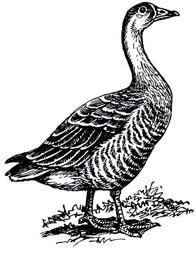 Серый гусь (Anser anser) (табл. 12, 13) - крупная птица, с плотным телосложением, относительно длинной шеей, небольшой головой, толстым клювом и умеренной длины ногами, снабженными плавательными перепонками. Вес его колеблется от 2,5 до 4,4 кг, изредка до 6 кг.