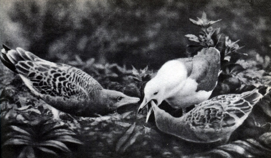 К подсемейству чаек относятся птицы крупной и средней величины, размером от гуся до галки. Телосложение у чаек плотное, крылья длинные, ноги умеренной длины. Хвост прямосрезанный или слегка закругленный, и только как редкое исключение с выемкой. Клюв сильный, с загнутым вниз крючком надклювья, покрыт сплошным роговым чехлом. Плавательные перепонки на ногах цельные. В окраске преобладает белый цвет, лишь на верхней стороне тела наблюдается голубовато-серый, а иногда светлый и аспидно-черный. Самец и самка окрашены одинаково, но отличаются размерами: первые крупнее вторых. Чайки - прекрасные летуны, большую часть жизни проводят в воздухе, высматривая добычу. Они хорошо плавают, но нырять не могут. ![]() Таблица 31. Птицы Приморского края. Чернохвостая чайка (Larus crassirostris) с птенцами Белая чайка (Pagophila eburnea) no величине немного крупнее обыкновенной чайки. Это весьма подвижная птица, легким и быстрым полетом напоминающая крачек. По земле ходит хорошо, может даже перебегать. Садится на воду неохотно. Окраска оперения взрослых чисто-белая, молодых - белая с темными пестринами. Населяет острова Северного Ледовитого океана в пределах как Европы и Азии, так и Северной Америки. В СССР встречается на Новой Земле, Земле Франца-Иосифа, островах Беннета, Геральда. Во внегнездовое время кочует в пределах Северного Ледовитого океана, держась в море главным образом у края паковых льдов. Гнездится белая чайка как на скалистых, так и на ровных, низменных берегах, часто колониями. Прилетает к местам гнездования рано, в марте - апреле, но к размножению приступает поздно. Гнездо довольно большое, грубо сложенное из водорослей, травы и мха, с соломинами, щепками и перьями. В июле в гнездах появляются яйца. Кладка из 2, реже 1 или 3 яиц охристо-оливкового или буроватого цвета с темными пятнами. Насиживает преимущественно самка в течение немногим меньше месяца, начиная с откладки первого яйца. В августе выклевываются птенцы, одетые белым пухом. Взрослые птицы энергично защищают гнездо, нападают на пришельцев, задевая при этом человека лапами. В сентябре молодые поднимаются на крыло. В конце этого месяца и в октябре чайки покидают гнездовые места и начинают вести кочевой образ жизни. Полная, послебрачная линька протекает в июле - августе, частичная, пред-брачная - в марте - апреле. Питание белой чайки своеобразно. Пожалуй, в основном она кормится отбросами тюленьего и китобойного промысла, а также экскрементами моржей, тюленей, белого медведя. В связи с этим, по-видимому, распространение ее приурочено к окраинам льдов. Употребляет она в пищу также мелкую рыбу, различных беспозвоночных, нападает на птенцов. Как редкий вид, белая чайка заслуживает охраны. Обыкновенная моевка (Rissa tridactyla) (табл. 16) несколько крупнее обыкновенной чайки, весит 300-500 г. Окраска головы, шеи, брюшной стороны тела и хвоста белая; спина и крылья серые, лишь вершины их черные, без белых пятен. ![]() Рис. 165. Обыкновенная моевка (Rissa tridactyla) Распространена кругополярно. Гнездится по скалистым морским побережьям в высоких широтах Европы, Азии и Северной Америки, спускаясь к югу в пределах северных частей Атлантического и Тихого океанов. Моевка - типичная океаническая птица, живущая на берегах только в период размножения. Остальное время проводит в море, отлетая на зиму в умеренные части названных океанов. Весн