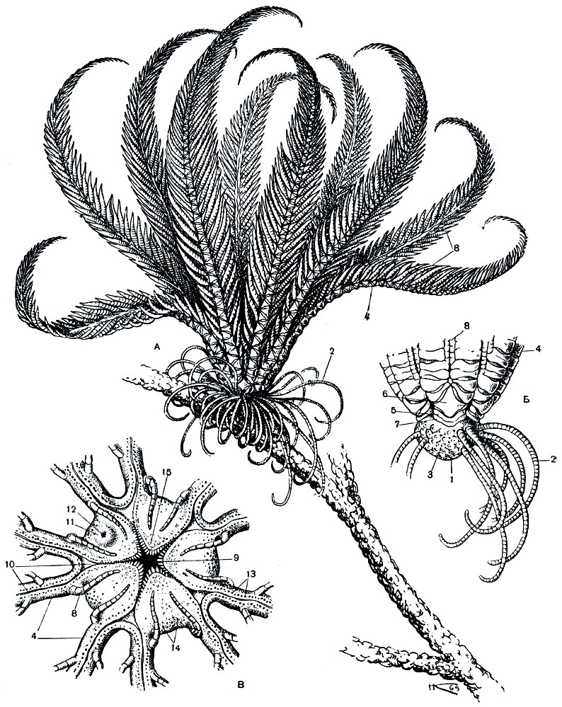 Рис. 130. Строение морской лилии Heliometra glacialis: А - внешний вид лилии; Б - детали чашечки и части лучей; В - ротовой диск молодой лилии (увеличено). 1 - центральный конус чашечки; 2 - цирры; 3 - места прикрепления цирр; 4 - лучи; 5 - первый членик (позвонок); 6 - второй членик лучей; 7 - радиальная пластинка; 8 - пиннулы; 9 - ротовое отверстие, усаженное папиллами; 10 - амбулакральные бороздки; 11 - анальное возвышение; 12 - анус; 13 - саккулы; 14 - поры, ведущие в ресничные воронки; 15 - рудементарные пластинки ротового скелета
