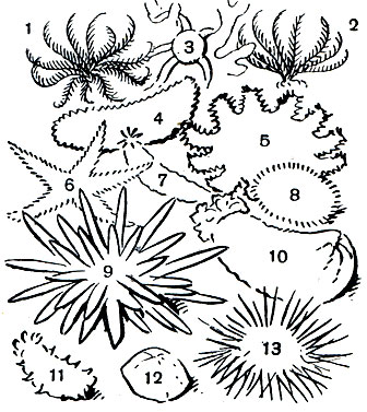 Характерный признак представителей данного отряда указан в самом его названии: голотурии обладают короткими щитовидными щупальцами (рис. 135), которые не втягиваются внутрь, так как у них отсутствуют мускулы-ретракторы, вворачивающие передний конец тела. Своим внешним видом эти животные напоминают очень крупных червей, а иногда толстую подошву. У многих форм брюшная сторона заметно отличается от спинной и приспособлена для ползания. Щитовиднощупальцевых голотурий можно встретить на литорали и в прибрежных водах, а также на больших глубинах, причем среди них имеются настоящие глубоководные виды, относящиеся к таким родам, как Paelopatides и Paroriza. Эти виды живут преимущественно на глубинах более 2 тыс. м и даже глубже 6 тыс. м. Так, Paroriza grevei была найдена датской экспедицией 1950-1952 гг. на судне "Галатея" в Тихом океане во впадине Банда на глубине 7280 м.