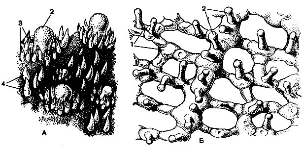 Рис. 141. Поверхность кожи аборальной стороны (А) и аборальный скелет (Б) морской звезды Asterias rubens: 1 - пластинки; 2 - иглы; 3 - педицеллярии; 4 - кожные жабры