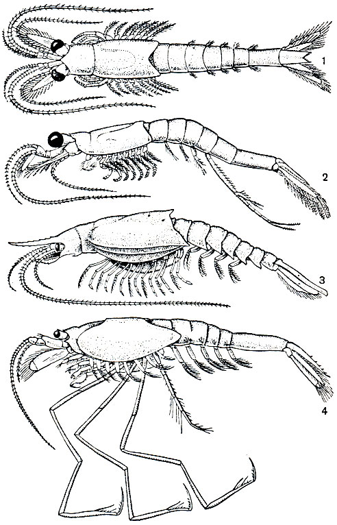 Другие глубоководные, как планктонные, так и донные, мизиды - хищники. У многочисленных в толще глубинных слоев Eucopia внутренние ветви всех грудных ножек снабжены подклешнями, причем три задние пары грудных ног удлиненные и, вероятно, действуют как ловчие ноги. Есть ловчие ноги и у придонного глубоководного Pethalophthalmus. Представители этих родов лишены фильтрующих щетинок на челюстях и, очевидно, могут питаться только за счет добывания других животных. Таким образом, для мизид, так же как и для веслоногих, отмечается повышение относительного количества хищников с увеличением глубины.